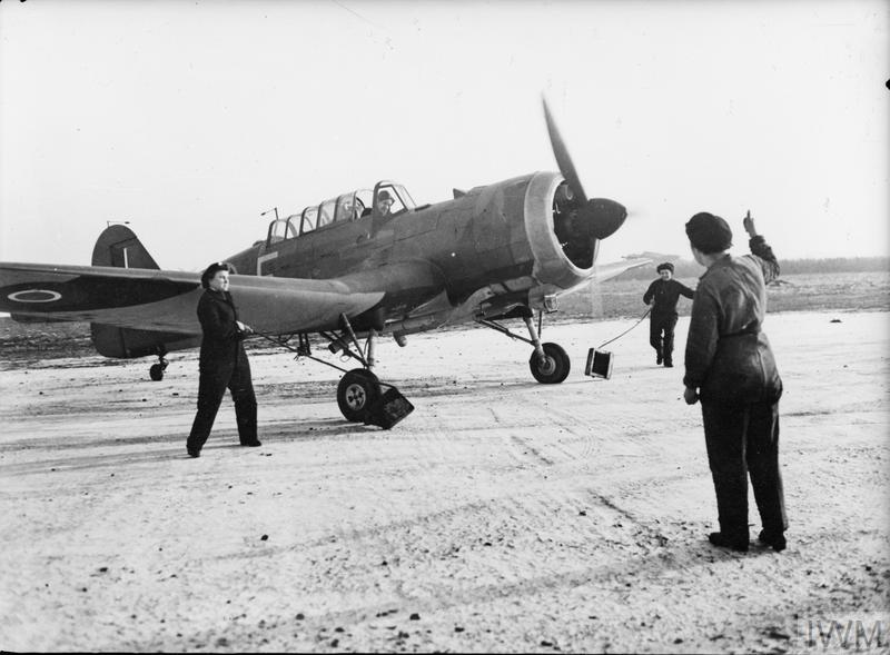 WAAF flight mechanics pull the chocks away from a Miles Martinet TT Mark I target tug of No. 289 Squadron RAF, on a hard standing at Turnhouse, Midlothian