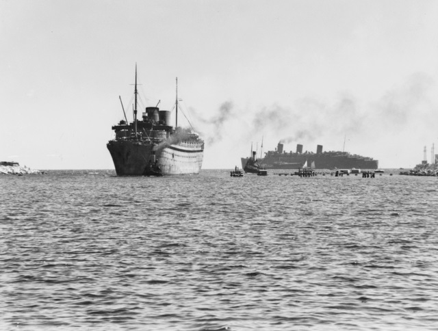 Nieuw Amsterdam entering Fremantle Harbour on 18 February 1943, with RMS Queen Mary in the background during the two ships' involvement in Operation Pamphlet